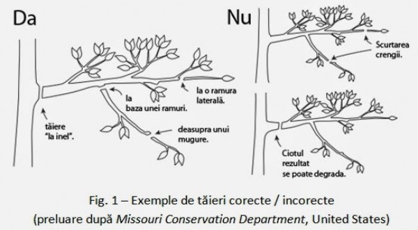 urmărindu‐se dezvoltarea naturală a arborelui. Lujerii fini (diam. <1 cm) se vor tăia deasupra unui mugure, lujerii normali (diam. 1‐3 cm) şi ramurile subţiri (diam. 3‐5 cm) se vor îndepărta direct de la baza ramurii din care derivă, sau în dreptul unei ramuri laterale ş.a.m.d. (Fig. 1). Se vor încuraja astfel direcţiile naturale de creştere ale arborelui, evitându‐se scurtarea sau secţionarea artificială/exagerată a coroanei (v. şi Fig. 2‐4.).