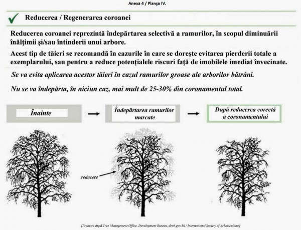 4.07.5. În efectuarea tuturor acestor tăieri se vor respecta avertismentele din Anexa 3 [Planşele III(A) & III(B)] şi regulile expuse în PLANŞA IV. Este interzisă scurtarea brutală, „în masă” a crengilor, fiind obligatorie urmărirea dezvoltării naturale a arborelui. Se va prefera de regulă tăierea „la inel” a ramurilor degradate şi păstrarea nesecţionată a ramurilor ascendente / laterale viabile.
