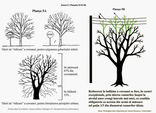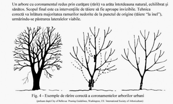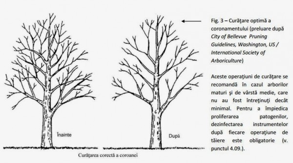 Prin urmare, metodele corecte de îngrijire a arborilor urbani sunt ilustrate mai jos. Ca regulă de bază, se reţine interzicerea tăierii a peste o treime (30%) din coronamentul original al arborelui.