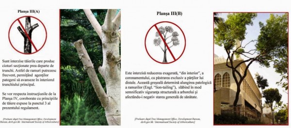4.07.5. În efectuarea tuturor acestor tăieri se vor respecta avertismentele din Anexa 3 [Planşele III(A) & III(B)] şi regulile expuse în PLANŞA IV. Este interzisă scurtarea brutală, „în masă” a crengilor, fiind obligatorie urmărirea dezvoltării naturale a arborelui. Se va prefera de regulă tăierea „la inel” a ramurilor degradate şi păstrarea nesecţionată a ramurilor ascendente / laterale viabile.