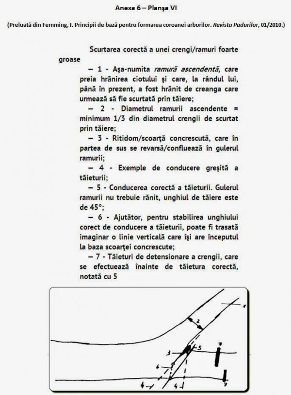 obligatoriu ca tăierea să fie condusă astfel încât pe partea care rămâne pe trunchi să mai existe o ramură ascendentă, intactă şi vie, care să aibă minimum o treime din grosimea crengii tăiate (cf. Femmig, 2010) (v. PLANŞA VI).